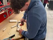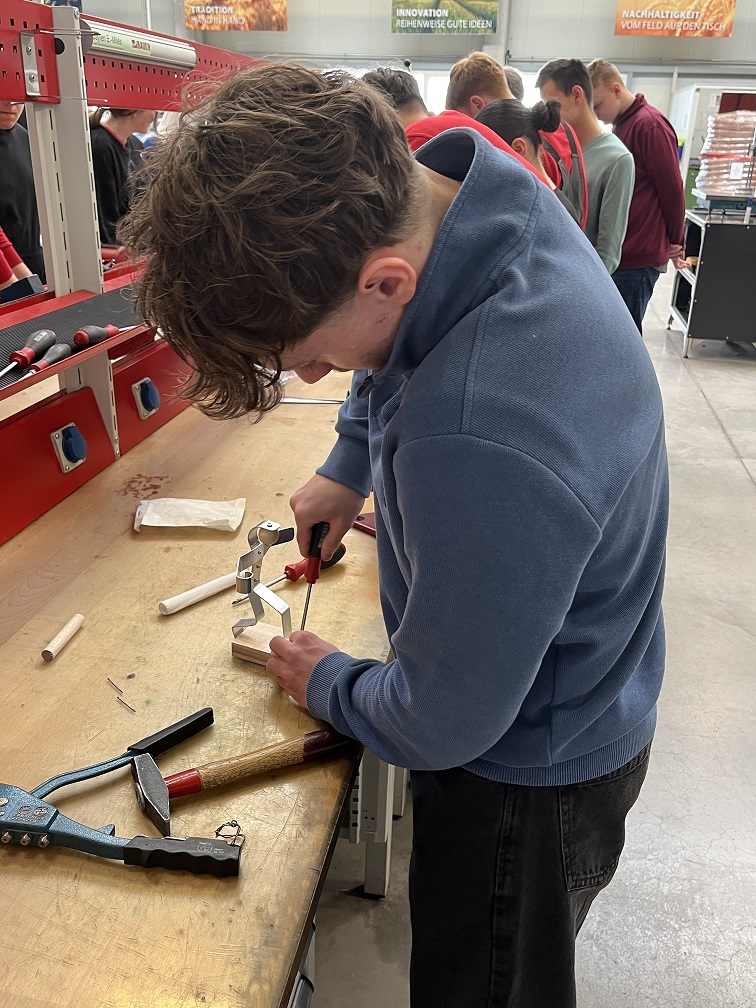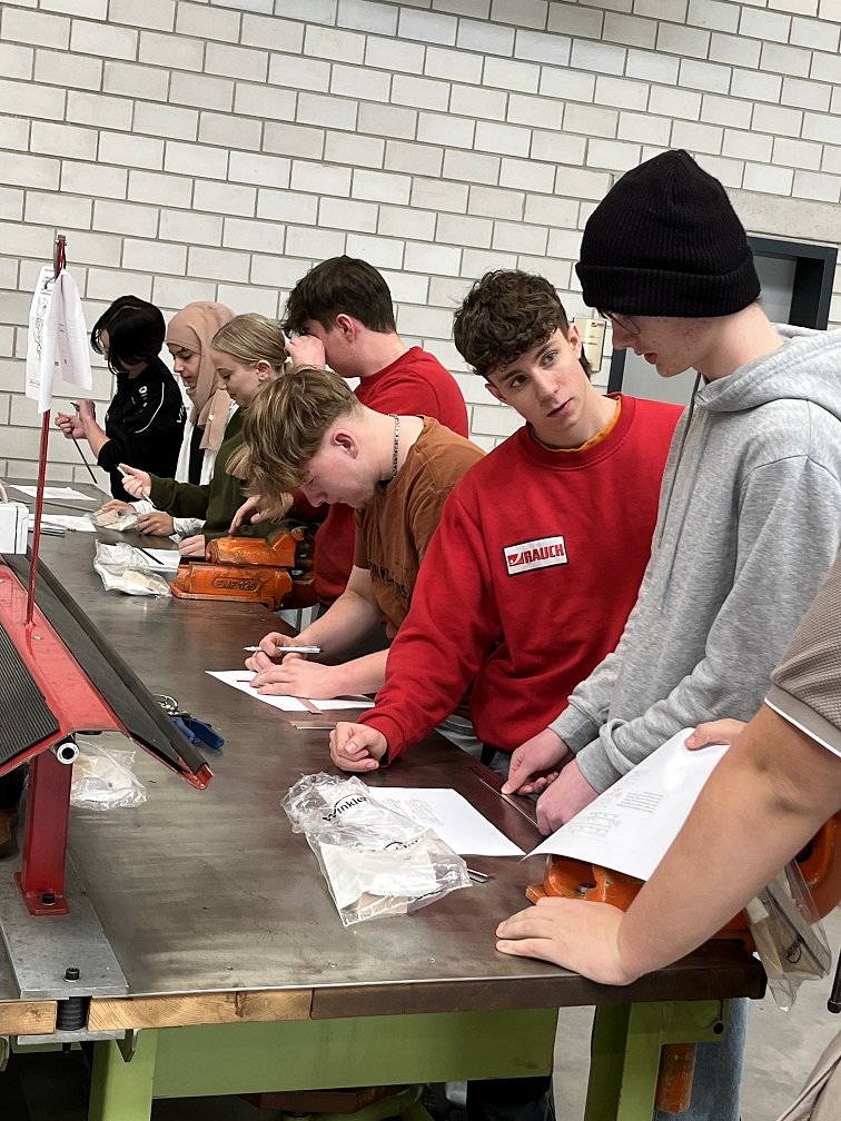 Die Organisation des Tages war hervorragend. Der Ausbildungsleiter und sein Team hatten alles bestens vorbereitet, sodass wir reibungslos von Station zu Station wechseln konnten. Die einzelnen Arbeitsschritte umfassten das Schneiden, Feilen, Formen, Bohren und Zusammenfügen der Teile, was uns nicht nur handwerkliche Fähigkeiten vermittelte, sondern auch die Bedeutung von Teamarbeit und Kreativität in der Werkstatt verdeutlichte.