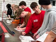Bereits zu Beginn der Besichtigung war das große Interesse der Schülerinnen und Schülern spürbar. Nach einer gemeinsamen Begrüßung und einer Stärkung mit Butterbrezeln sowie einigen Hinweisen konnten wir den Herstellungsprozess des Vasenmännchens starten. Die Auszubildenden erklärten uns die einzelnen Schritte und führten uns durch die verschiedenen Stationen, an denen wir die Einzelteile bearbeiten mussten. Jeder Schritt war klar strukturiert und die Auszubildenden standen uns jederzeit mit Rat und Tat zur Seite. Es war beeindruckend zu sehen, wie motiviert und engagiert sie ihr Wissen und ihre Fähigkeiten weitergaben.
